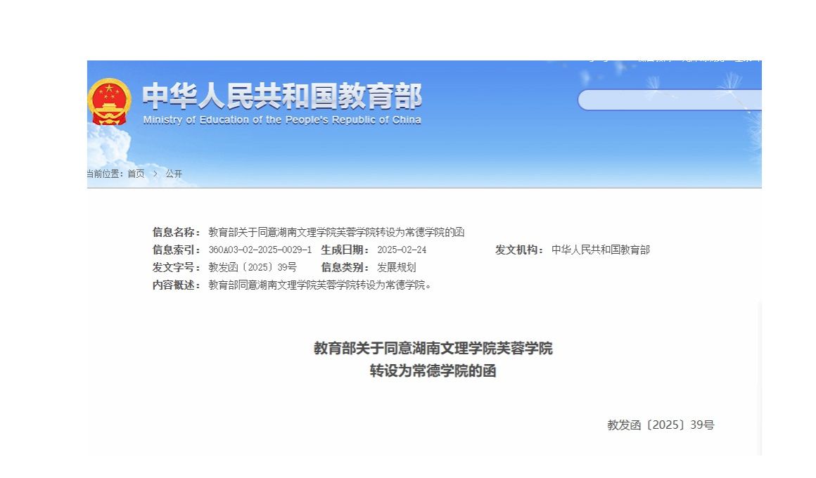 教育部關(guān)于同意湖南文理學(xué)院芙蓉學(xué)院轉(zhuǎn)設(shè)為常德學(xué)院的函