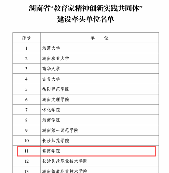 12月14日,省教育廳正式公布首批“教育家精神創(chuàng)新實(shí)踐共同體”建設(shè)牽頭單位名單。全省共遴選出28家牽頭單位,常德學(xué)院憑借扎實(shí)的工作基礎(chǔ)與鮮明特色,成功入選。