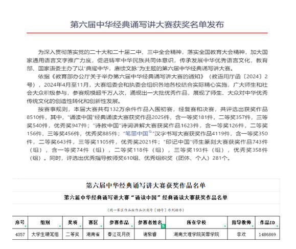 第六屆中華經(jīng)典誦寫(xiě)講大賽由教育部、國(guó)家語(yǔ)言文字委員會(huì)舉辦,是“中華經(jīng)典誦讀工程”四項(xiàng)賽事之一,經(jīng)過(guò)湖南省語(yǔ)言文字工作委員會(huì)嚴(yán)格評(píng)選,謝紫睿同學(xué)的作品斬獲省級(jí)一等獎(jiǎng),并被推薦參加全國(guó)決賽,榮獲全國(guó)二等獎(jiǎng)。此次參賽獲獎(jiǎng)不僅展現(xiàn)了我校師生的卓越風(fēng)采,也彰顯了學(xué)院對(duì)傳承中華優(yōu)秀傳統(tǒng)文化、提升學(xué)生文化素養(yǎng)及促進(jìn)學(xué)生全面發(fā)展的高度重視。