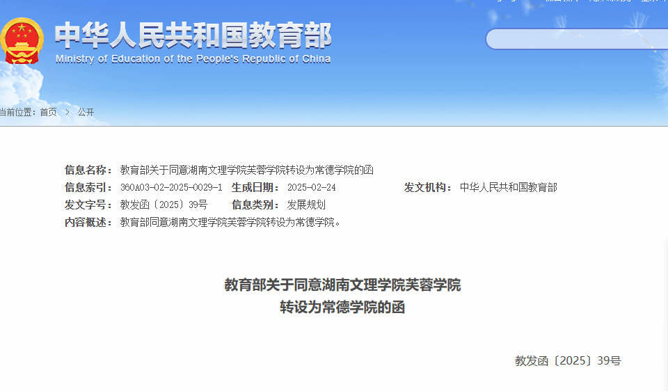 《湖南省人民政府關(guān)于申報湖南文理學院芙蓉學院轉(zhuǎn)設為常德學院的函》(湘政函〔2024〕65號)收悉。根據(jù)《中華人民共和國高等教育法》《中華人民共和國民辦教育促進法》《中華人民共和國民辦教育促進法實施條例》《普通高等學校設置暫行條例》等有關(guān)規(guī)定以及第八屆全國高等學校設置評議委員會評議結(jié)果,經(jīng)教育部黨組會議研究決定,同意湖南文理學院芙蓉學院轉(zhuǎn)設為常德學院,學校標識碼為4143012657;同時撤銷湖南文理學院芙蓉學院的建制,并根據(jù)現(xiàn)有在校生屆數(shù)設立過渡期?,F(xiàn)將有關(guān)事項函告如下。